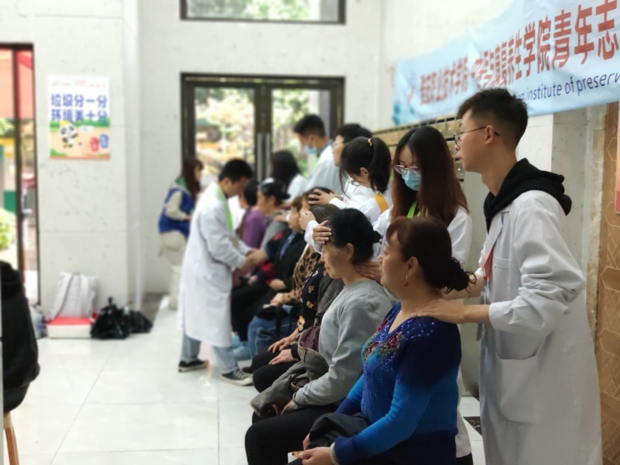 活动中,志愿者们热情地向社区居民宣讲健康知识,为有需要的群众进行肩颈推拿、艾灸,免费提供了冲泡的养生茶等服务。学生们的义诊活动得到汉碑社区居民的一致好评。