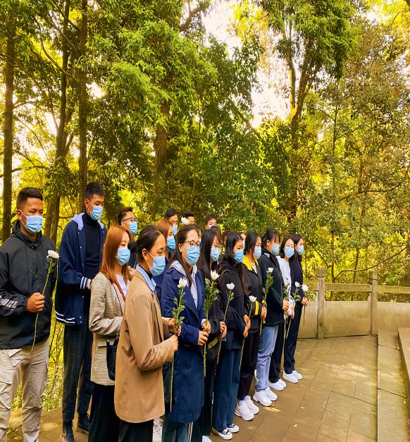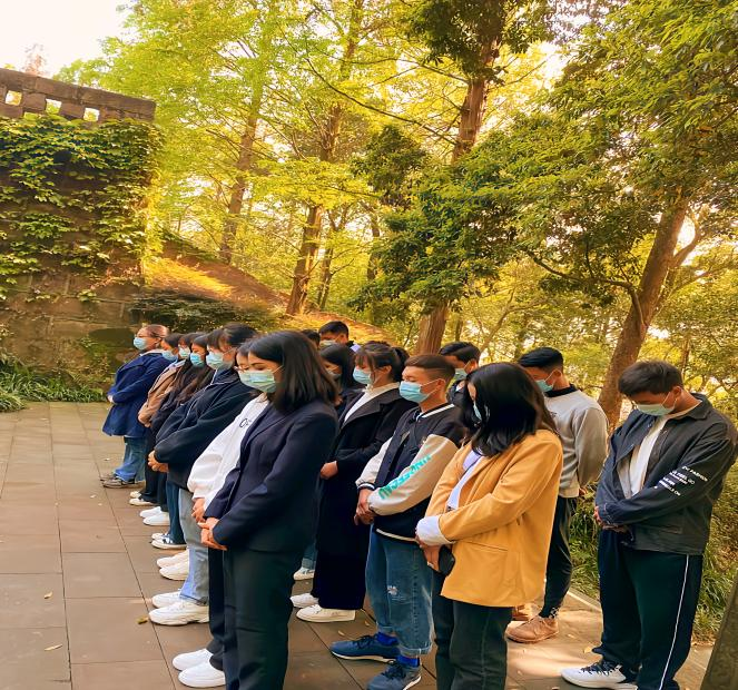 同学们小心翼翼地走在每一个阶梯上,到烈士纪念碑前,庄严有序地敬献手中的白花,深情三鞠躬,以此来表达对先烈的敬仰之情。接着,全体成员向革命烈士默哀三分钟致敬。最后,同学们参观了烈士纪念堂和陈列馆,聆听中国共产党光辉的发展历程,深刻感受革命先辈为民族解放、国家富强而勇于牺牲、奉献自我的崇高精神。